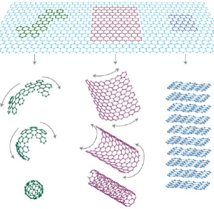 圖1. 石墨烯構(gòu)筑富勒烯、碳納米管以及石墨的示意圖[1]